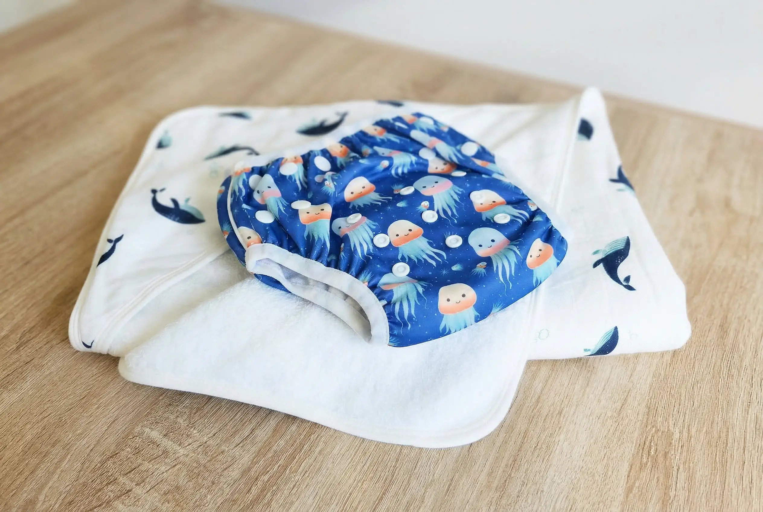 Une conception pensée pour l’eau : Contrairement à une couche classique, la couche de bain ne contient pas de partie absorbante — et c’est voulu ! Un insert absorbant gonflerait immédiatement au contact de l’eau. Ici, c’est le tissu lui-même qui fait le travail : il retient efficacement l’urine tout en restant léger et confortable pour bébé, même dans l’eau.
