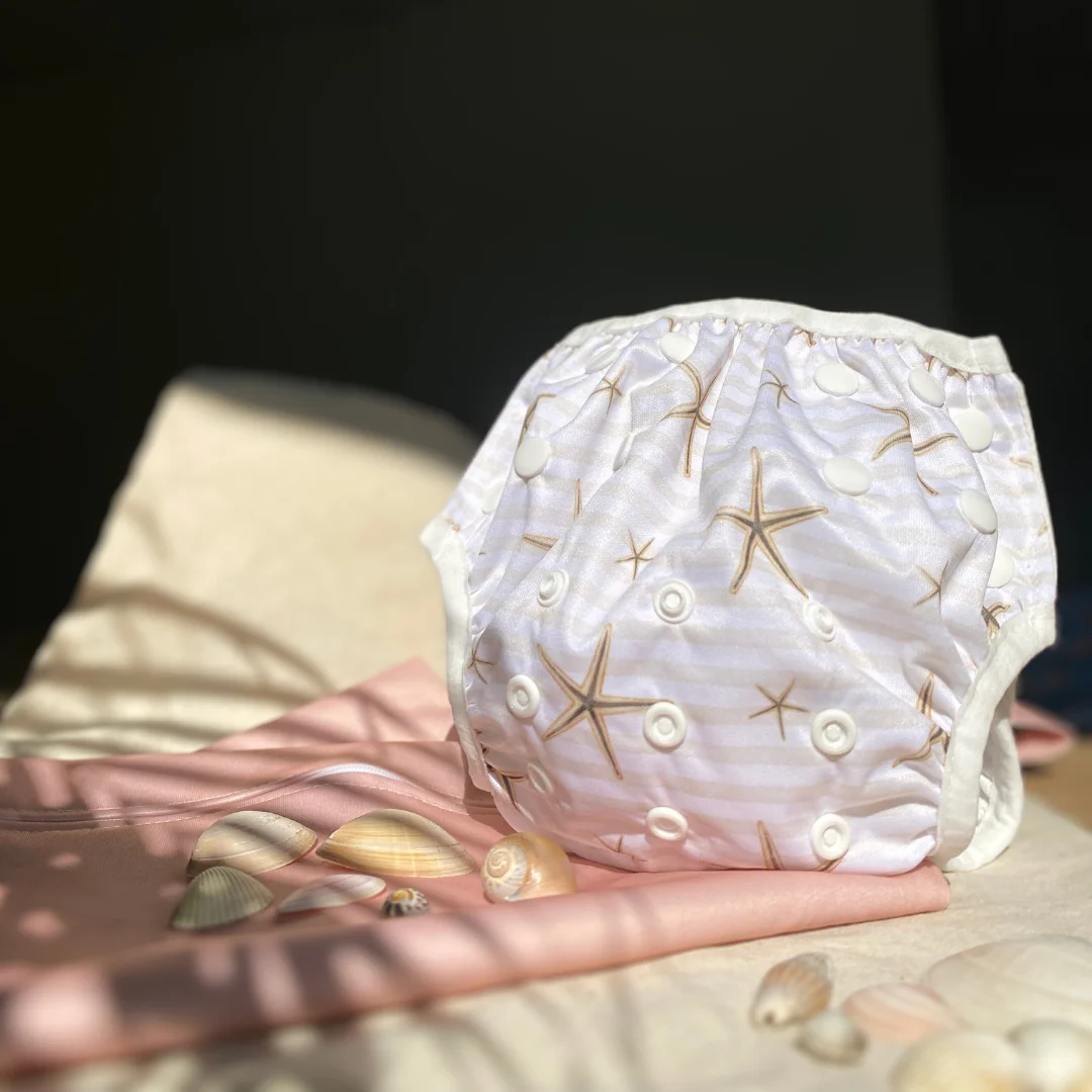 La couche de bain lavable ou couche de piscine (coloris Océan Étoilé ) s’utilise comme une couche de bain jetable classique. Elles retient l’urine lorsque bébé joue au bord de l’eau et retient aussi les gros accidents qui restent confinés dans la couche. Mieux que le maillot de bain qui ne retient pas les accidents et mieux que la couche de bain jetable, qui est… jetable ! Les couches de piscine B’bies ne contiennent pas de partie absorbante et pour cause, la couche gonflerait instantanément dans l’eau. En revanche, le tissu qui la compose retient parfaitement l’urine.